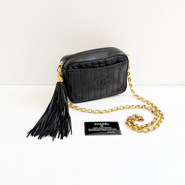 ※ オンラインに掲載されております商品は 店頭でも同時販売しております。 ※ 店頭で完売してしまった商品は随時消去しておりますが タイムラグが生じてしまう場合がございます.ご了承下さいませ. ※Tシャツやカットソー等のインナーウエアーは 店頭でもご試着が出来ません. ※モニター環境により 同じ色が出ない場合がございます. ※古着を扱っております為 多少の臭いがある事をご理解ください 臭いについての判断は においを感じる商品にかぎり 記載させていただきます. ご理解の程お願いいたします. ※購入確定後のお客様の都合によるキャンセルはお断りさせていただいております. ※ 中古品.ヴィンテージという事を前提に ご理解をして頂きました上で ご購入をお願いいたします. 商品につきましては お電話にて随時お問い合わせください. 店舗ではオンラインショップには無い商品も多数ございます。 是非ご来店も お待ちしております. CHANEL ラムレザー ロングタッセル チェーン ショルダーバック 素材 ラムレザー 、メタル カラー ブラック 、ゴールド 金具 ゴールド フランス製 柔らかなレザーと 存在感のあるタッセル. 厚みのあるゴールドのチェーンショルダー 1985年から1989年製造の Vintage CHANELのデザインになります☆ フロントポケット1つ、 アウトポケット1つ 内側にファスナーポケット1つ 【商品コンディション】 目立つキズや汚れの無い 綺麗なヴィンテージコンディションになります。ケース無し size 縦 12.5cm 横 17.5cm マチ 6.5cm ショルダー紐 111cm