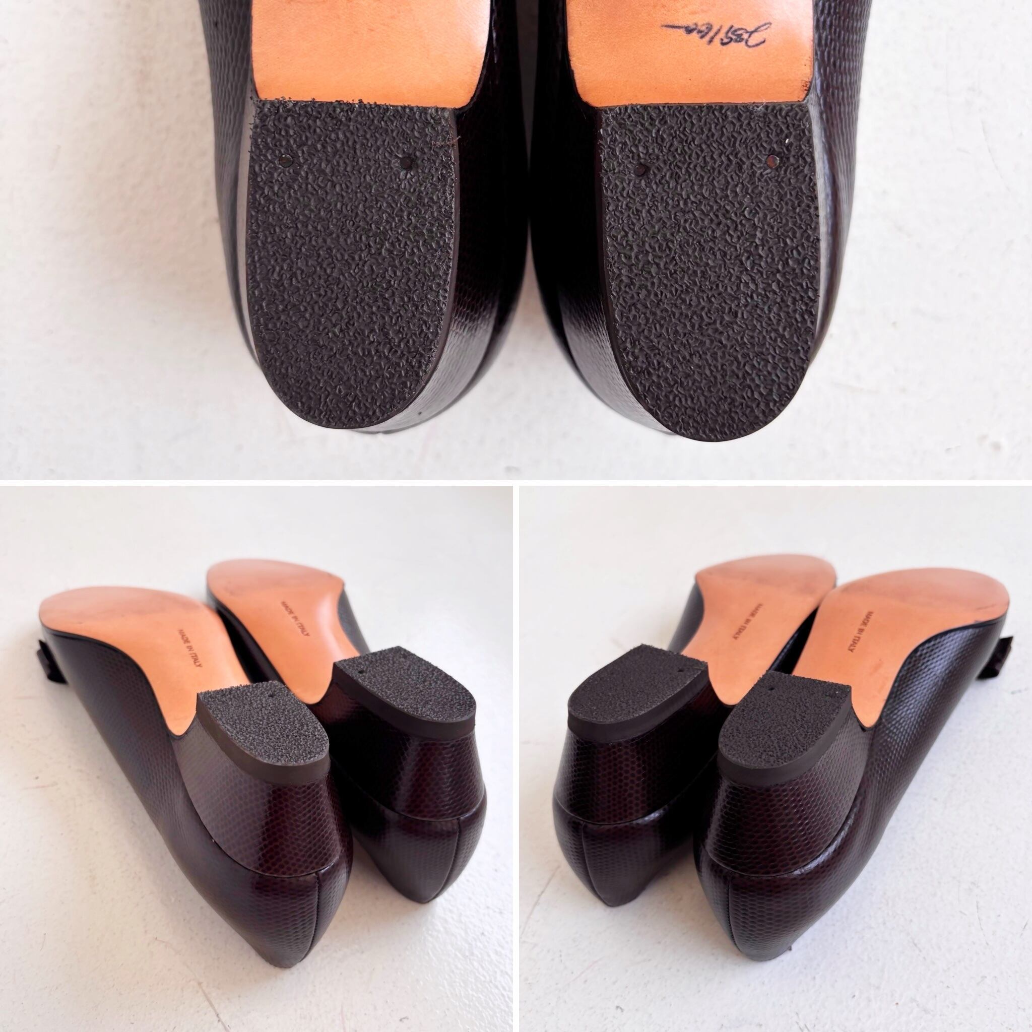 履いている時にヒール部分のゴム、アウトソールのゴムの破損が起こりうる場合がございます。
