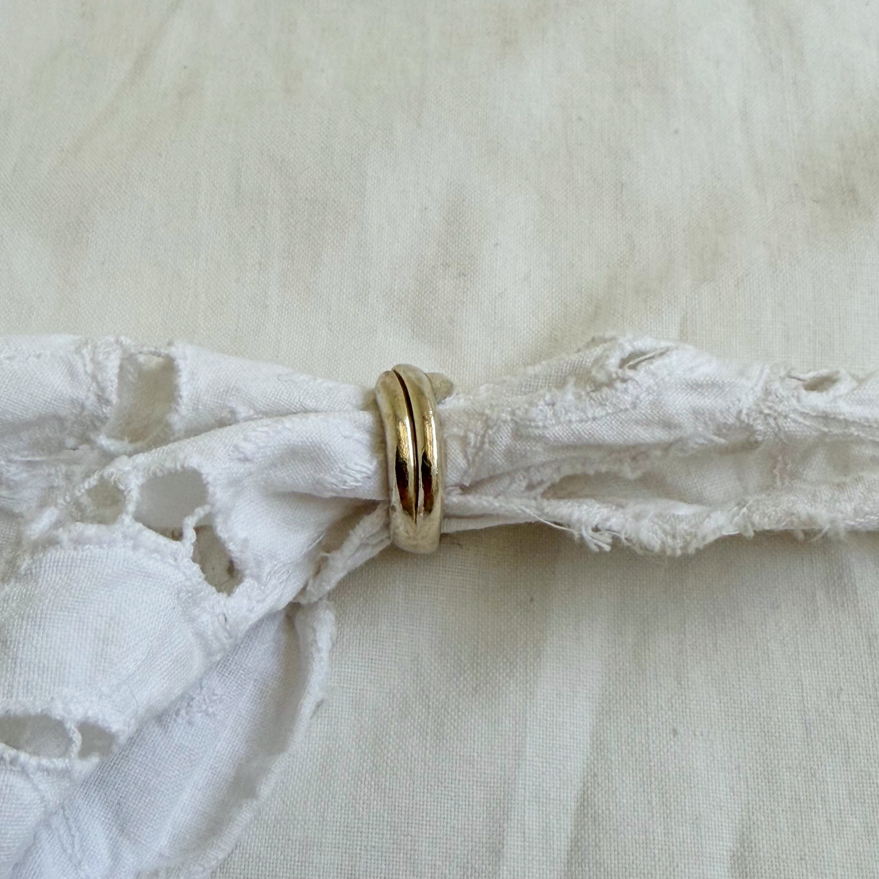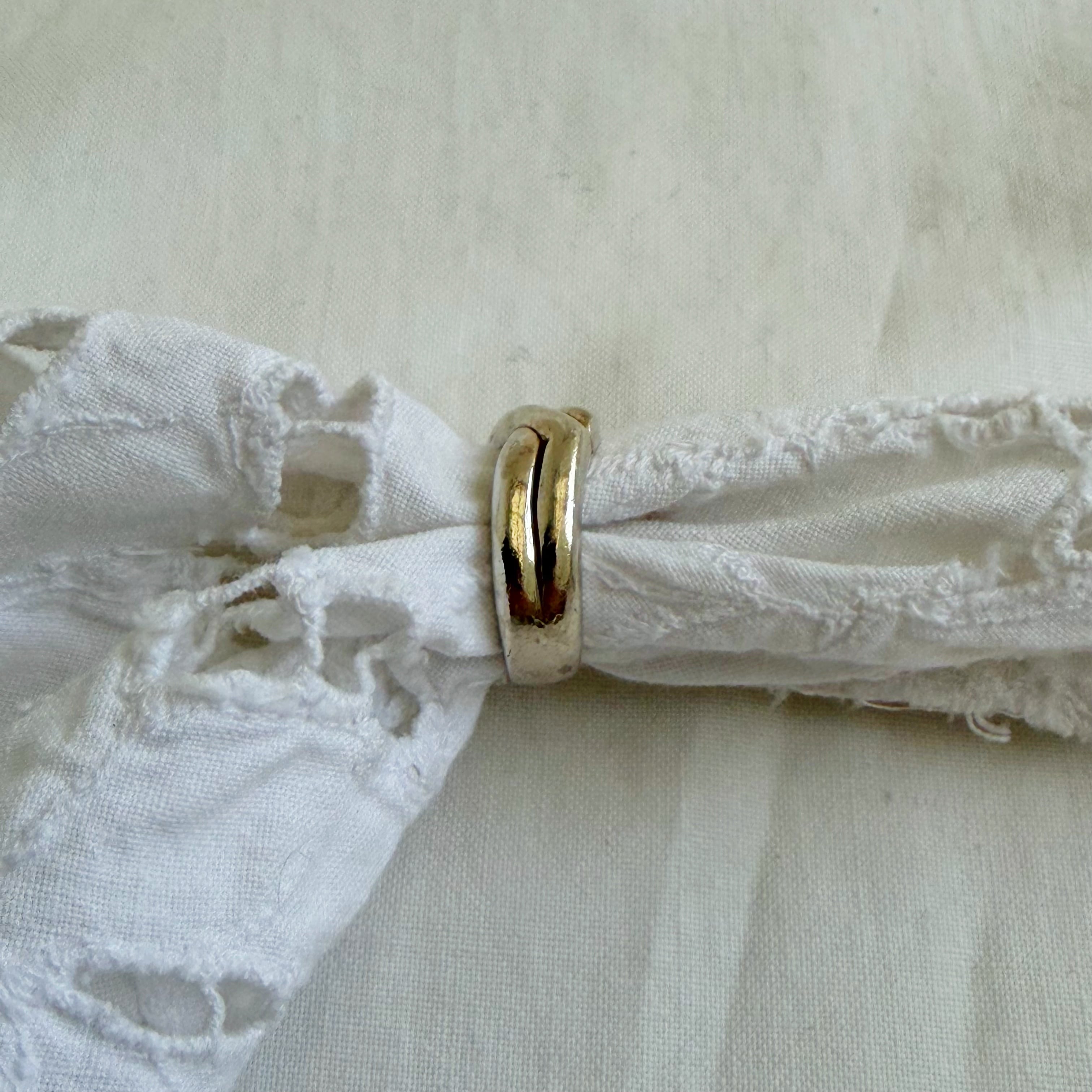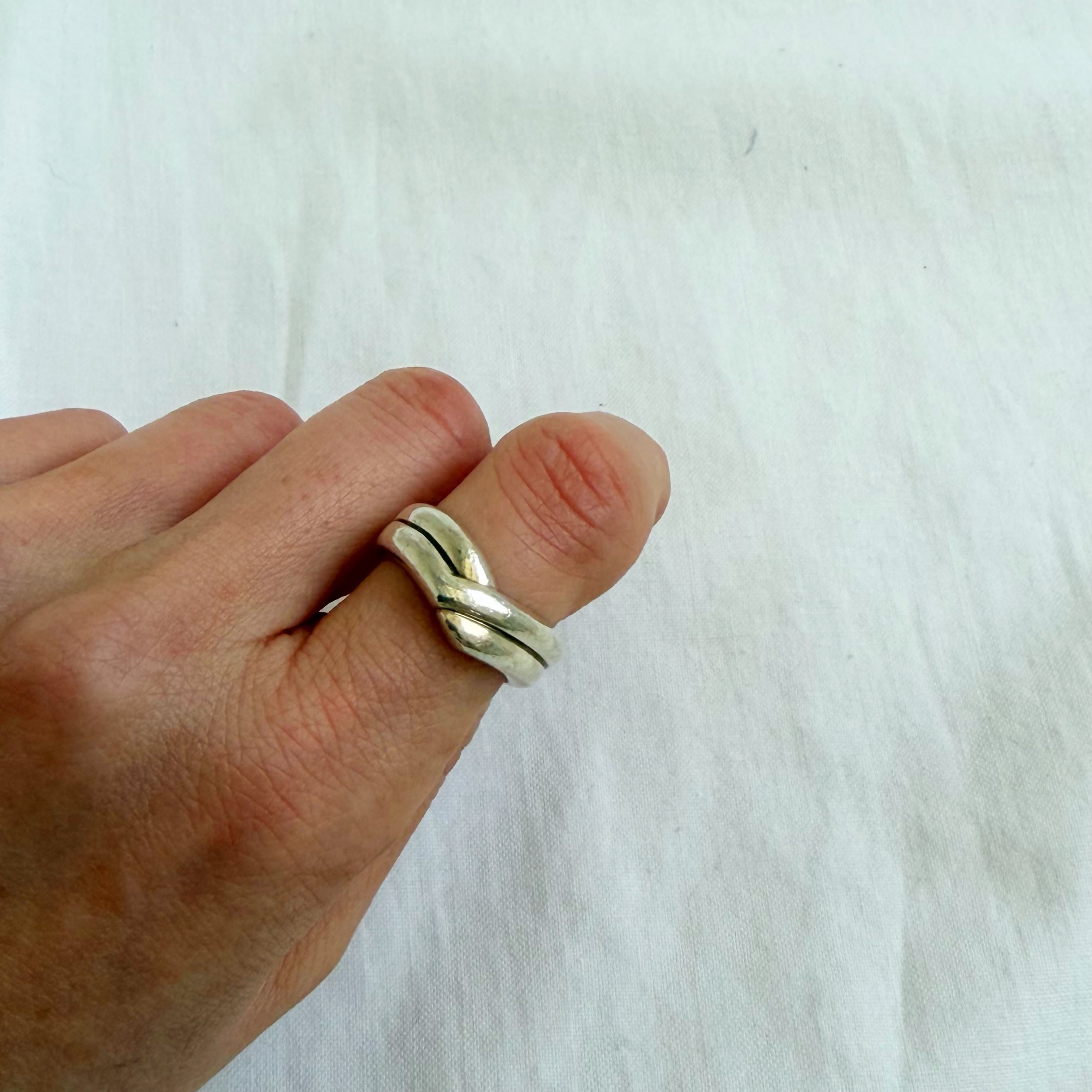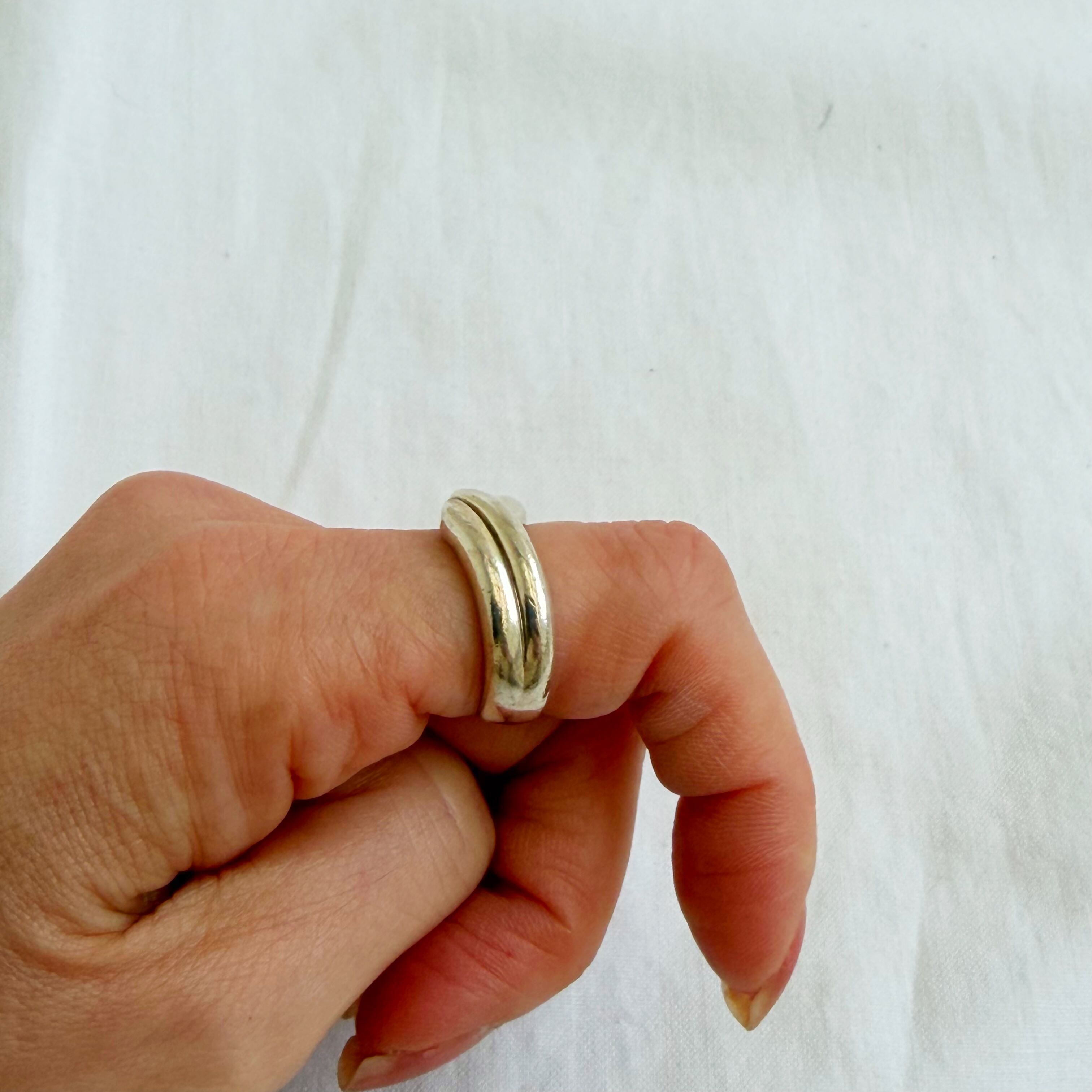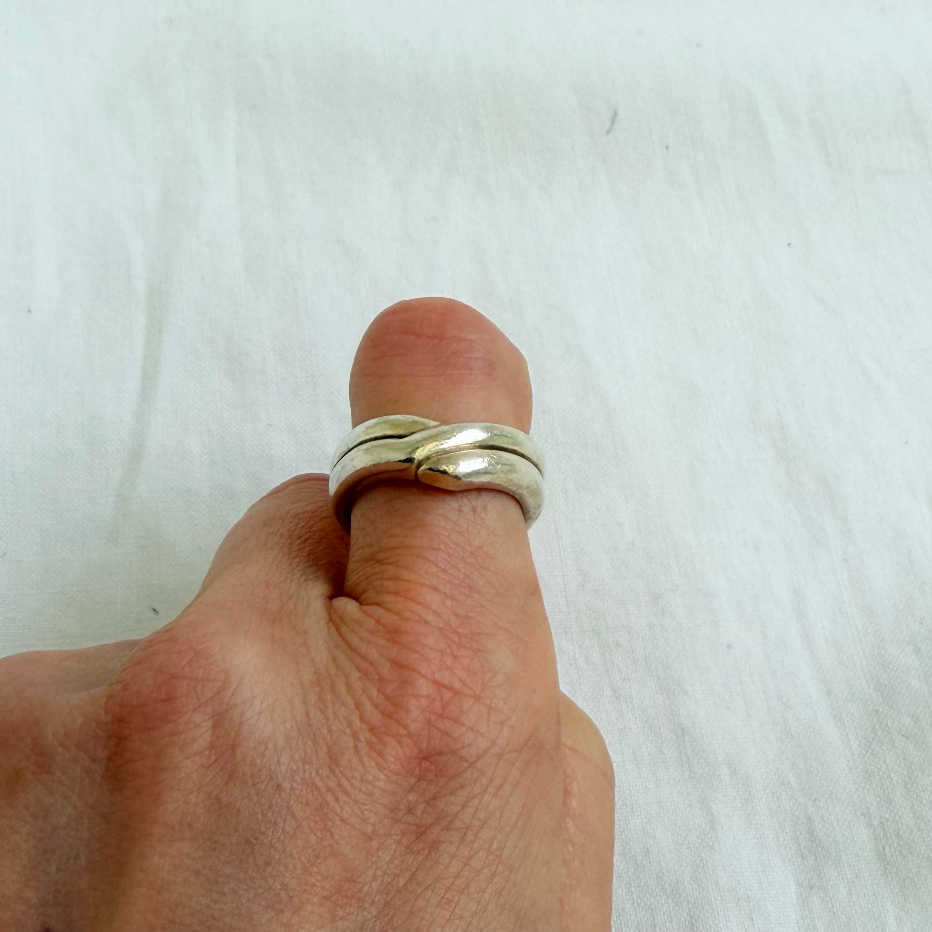2本のリングが重なったようなデザインのリングです。重ねづけにもおすすめです。