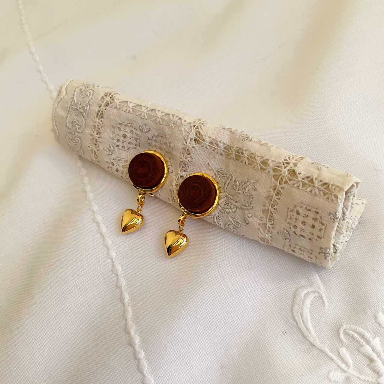 くるくると巻かれたブラウンのトップにぷくっとしたうずまきと ゴールドの♡がゆらゆらと