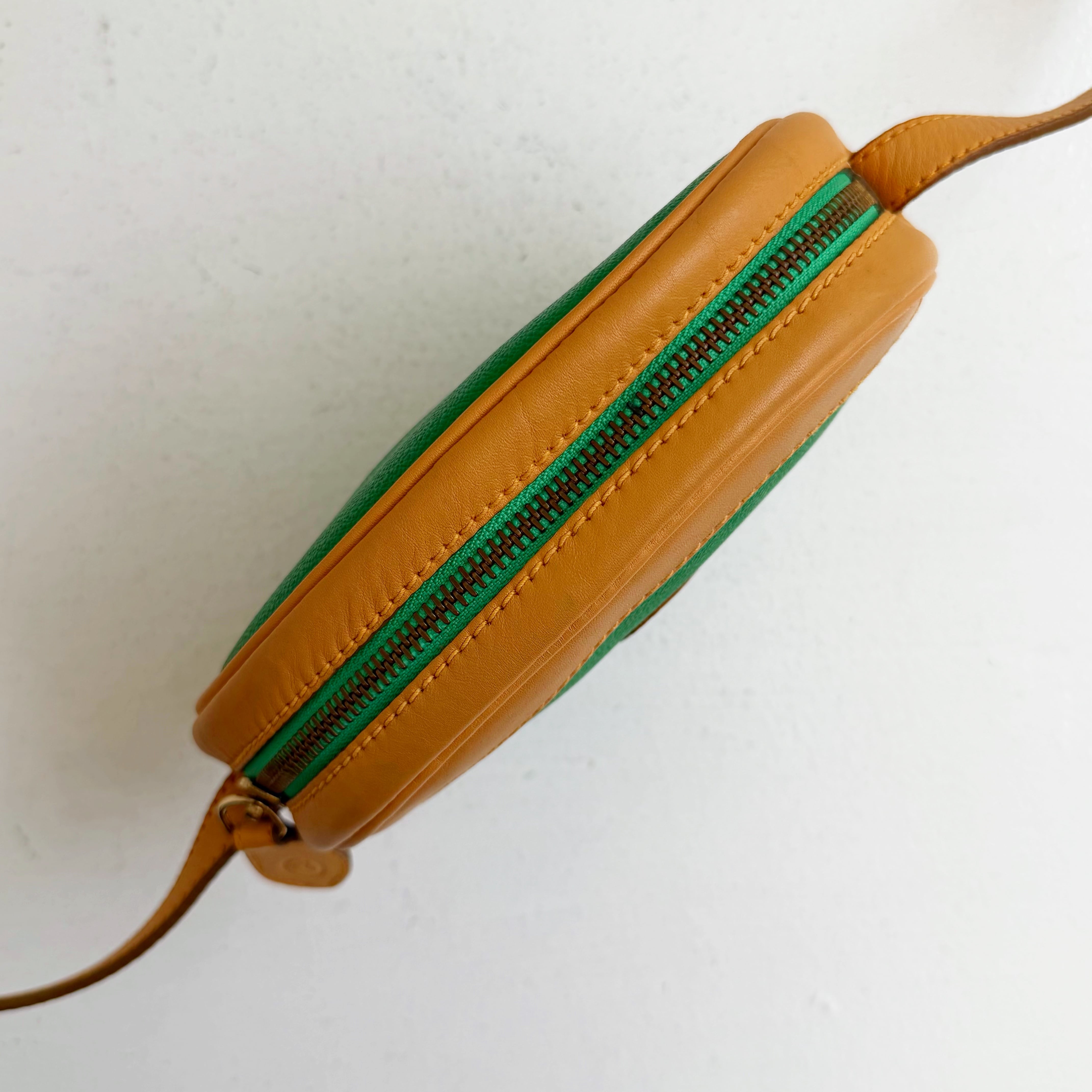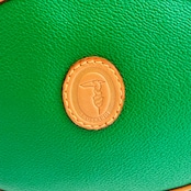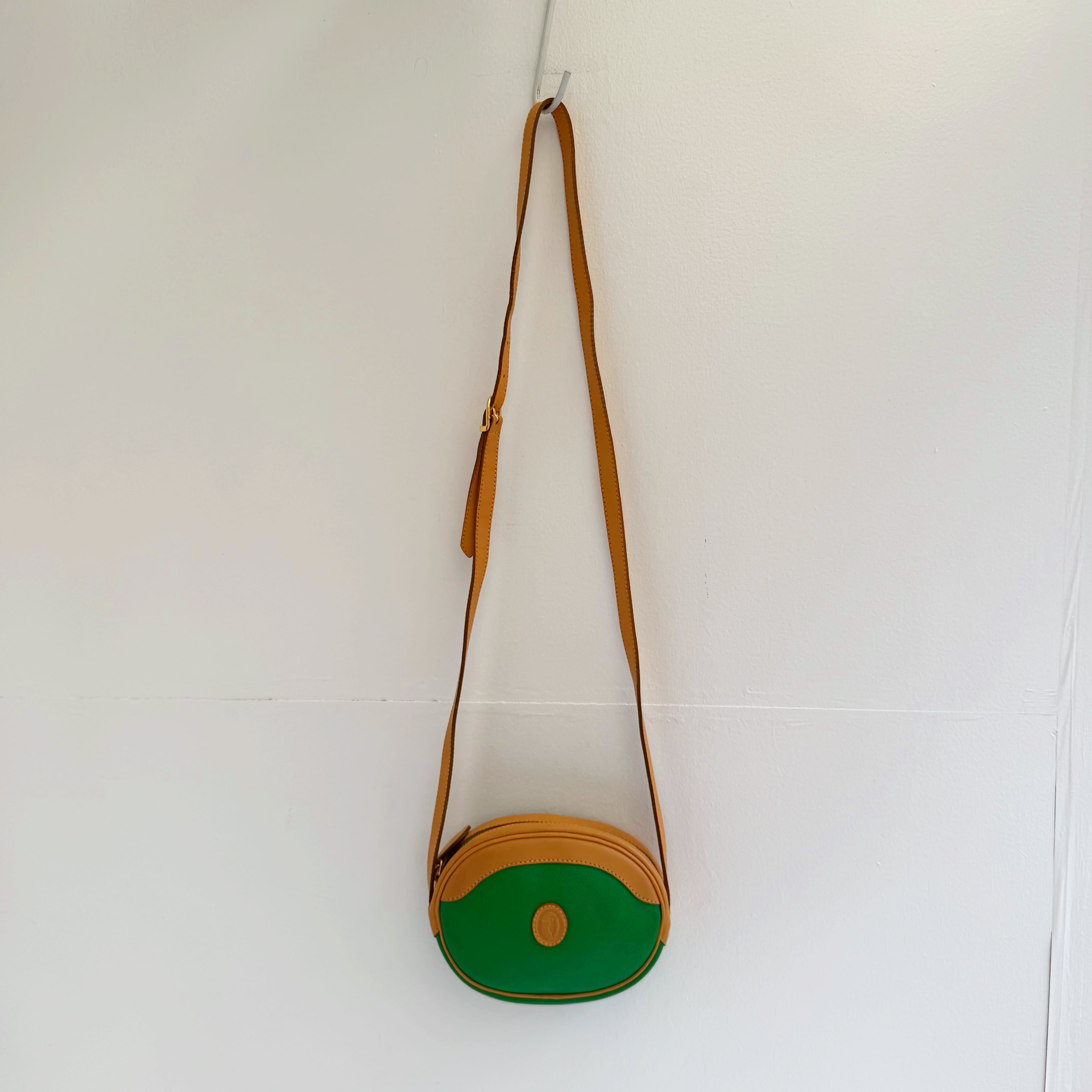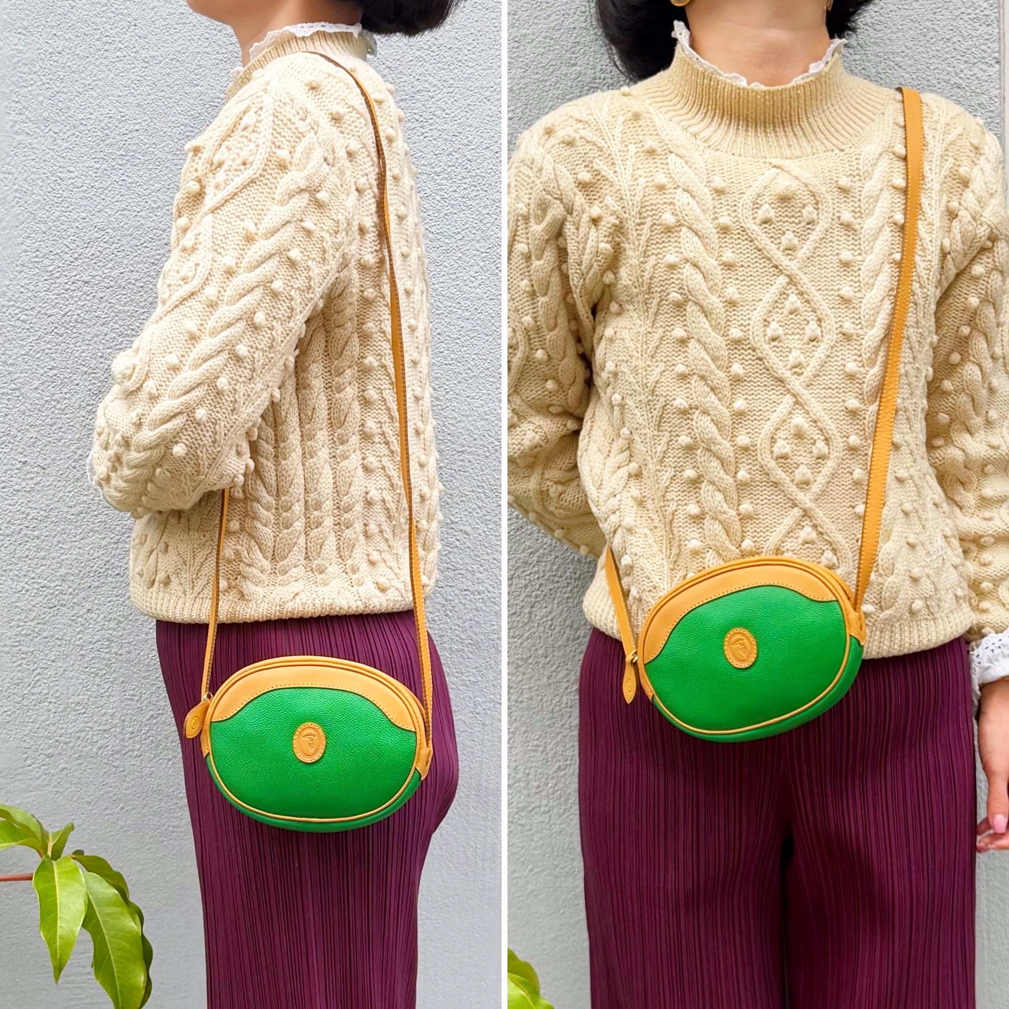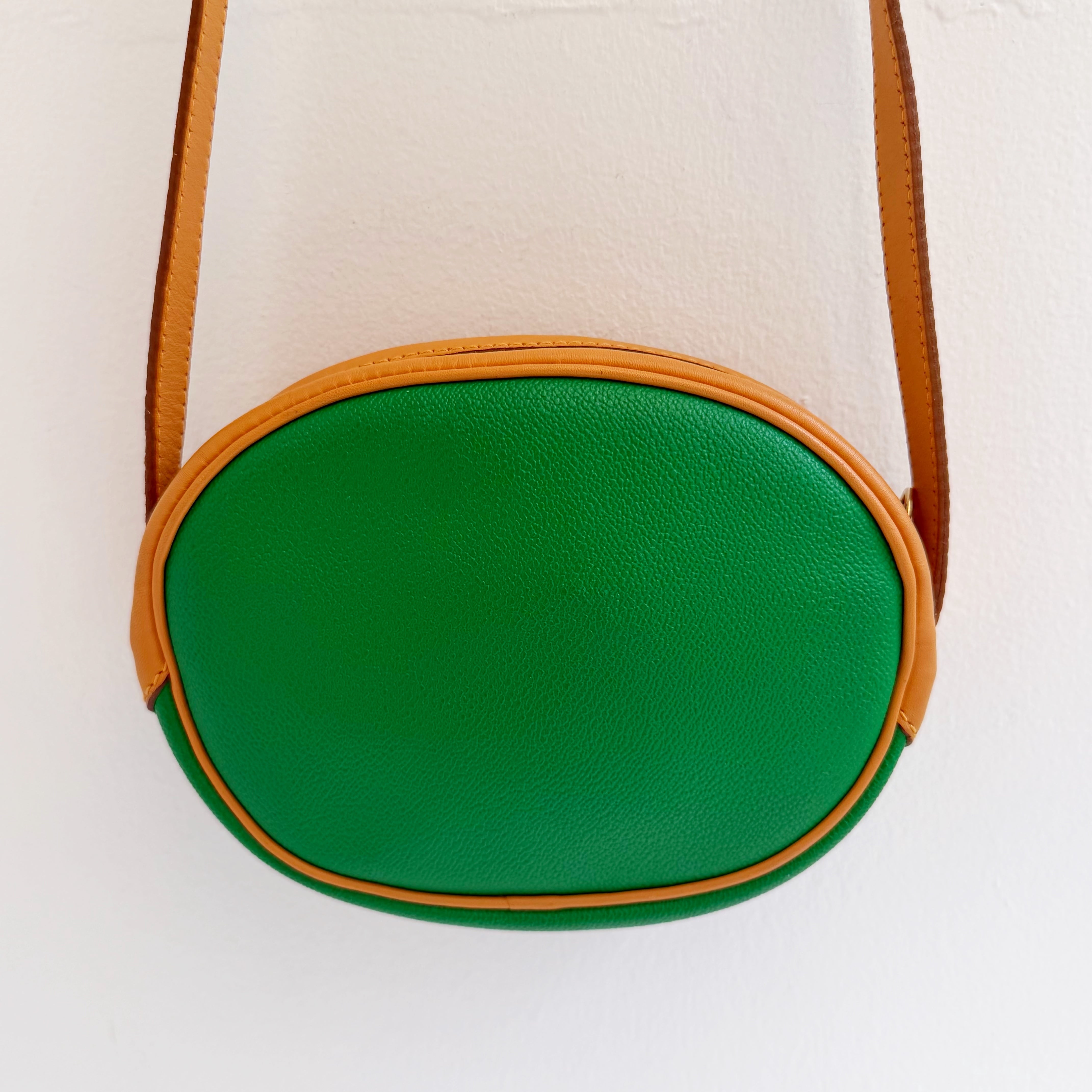 鮮やかなグリーンとベージュカラーのバイカラーショルダーバックです、