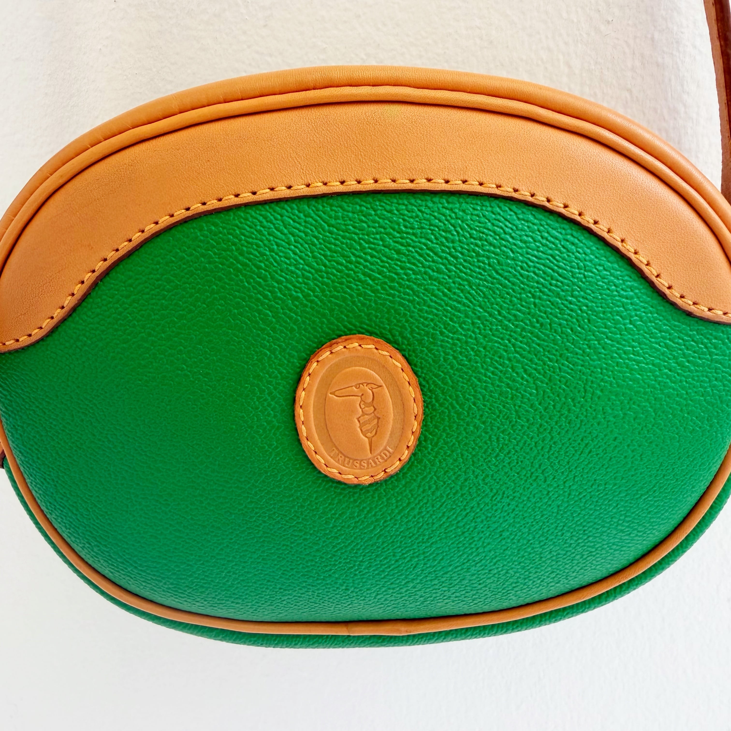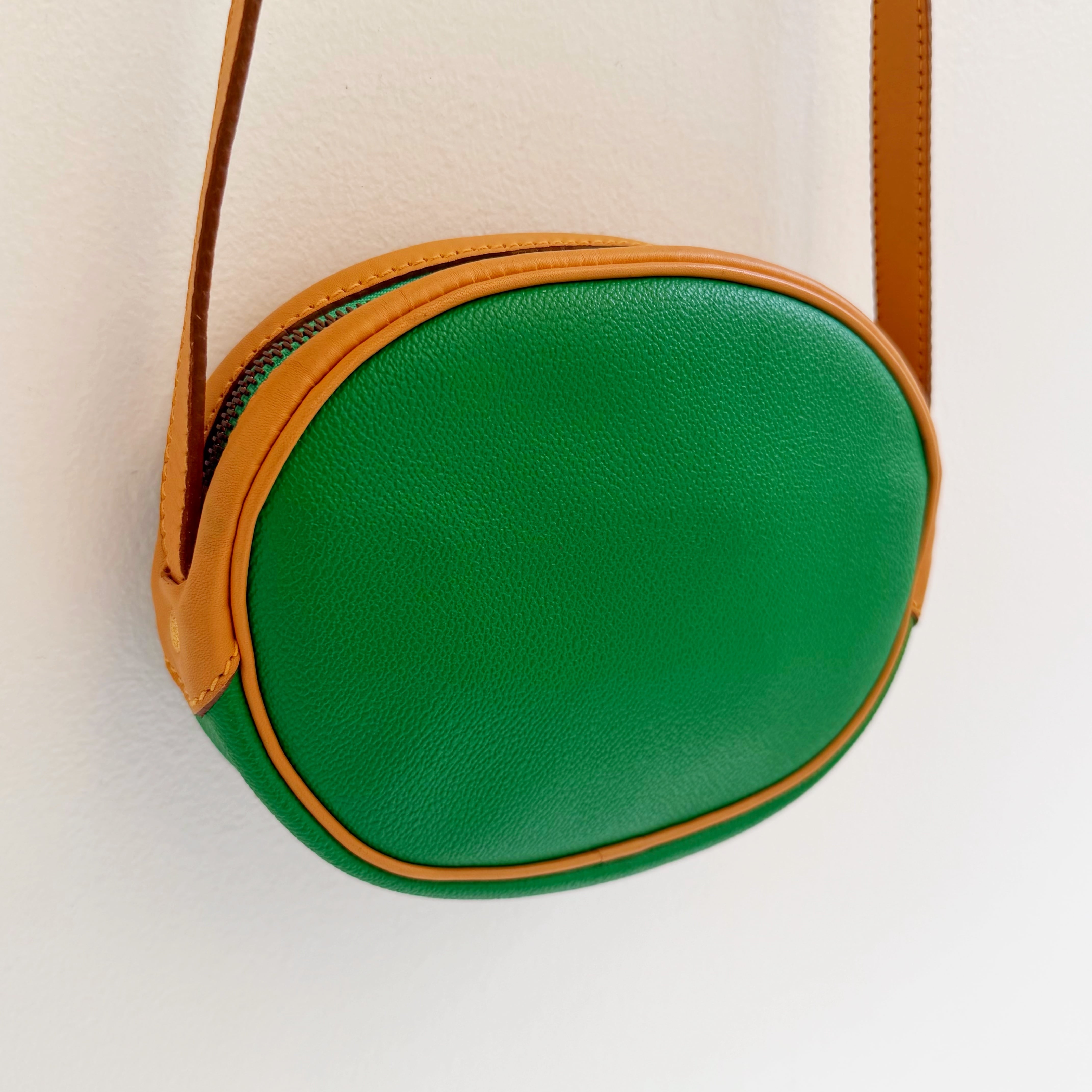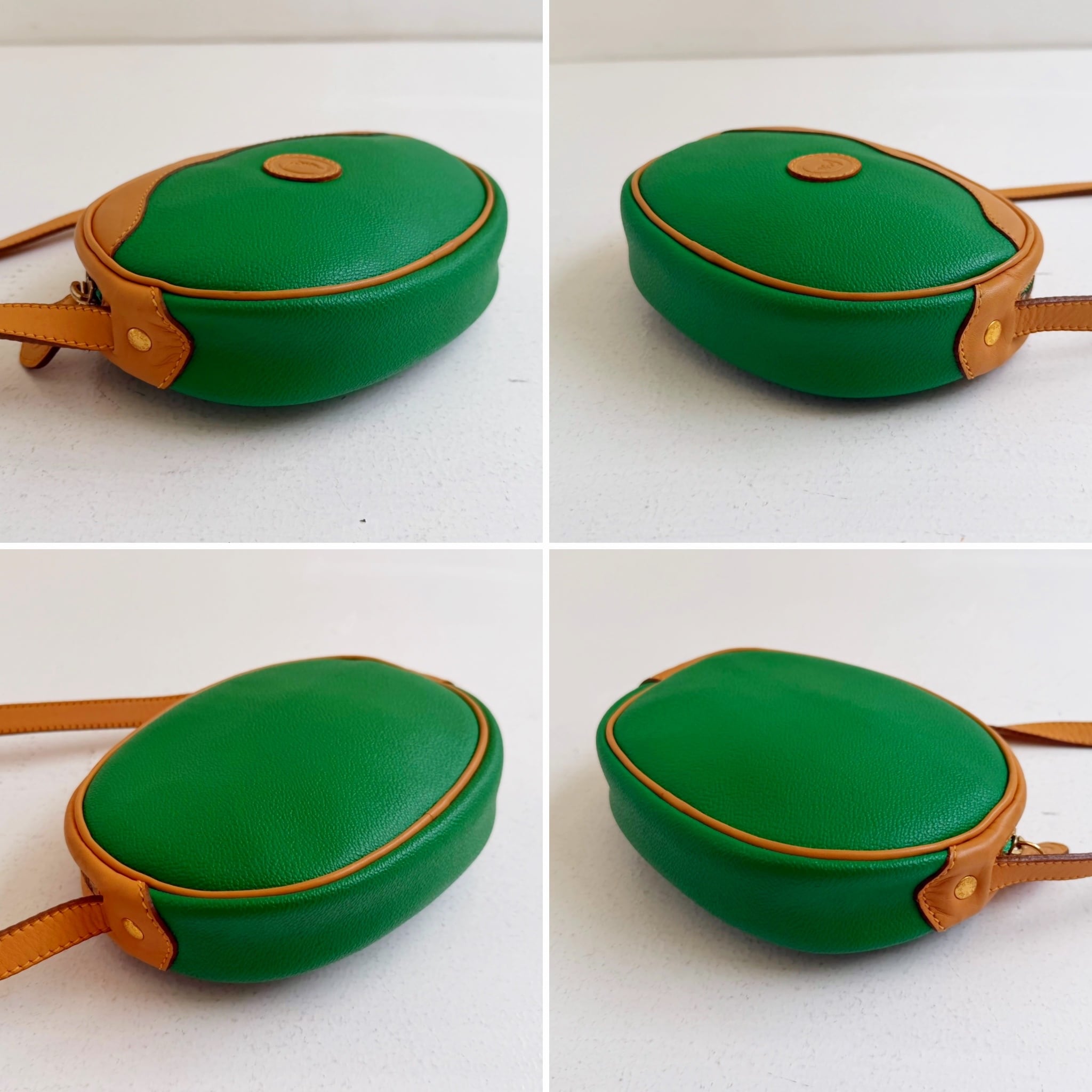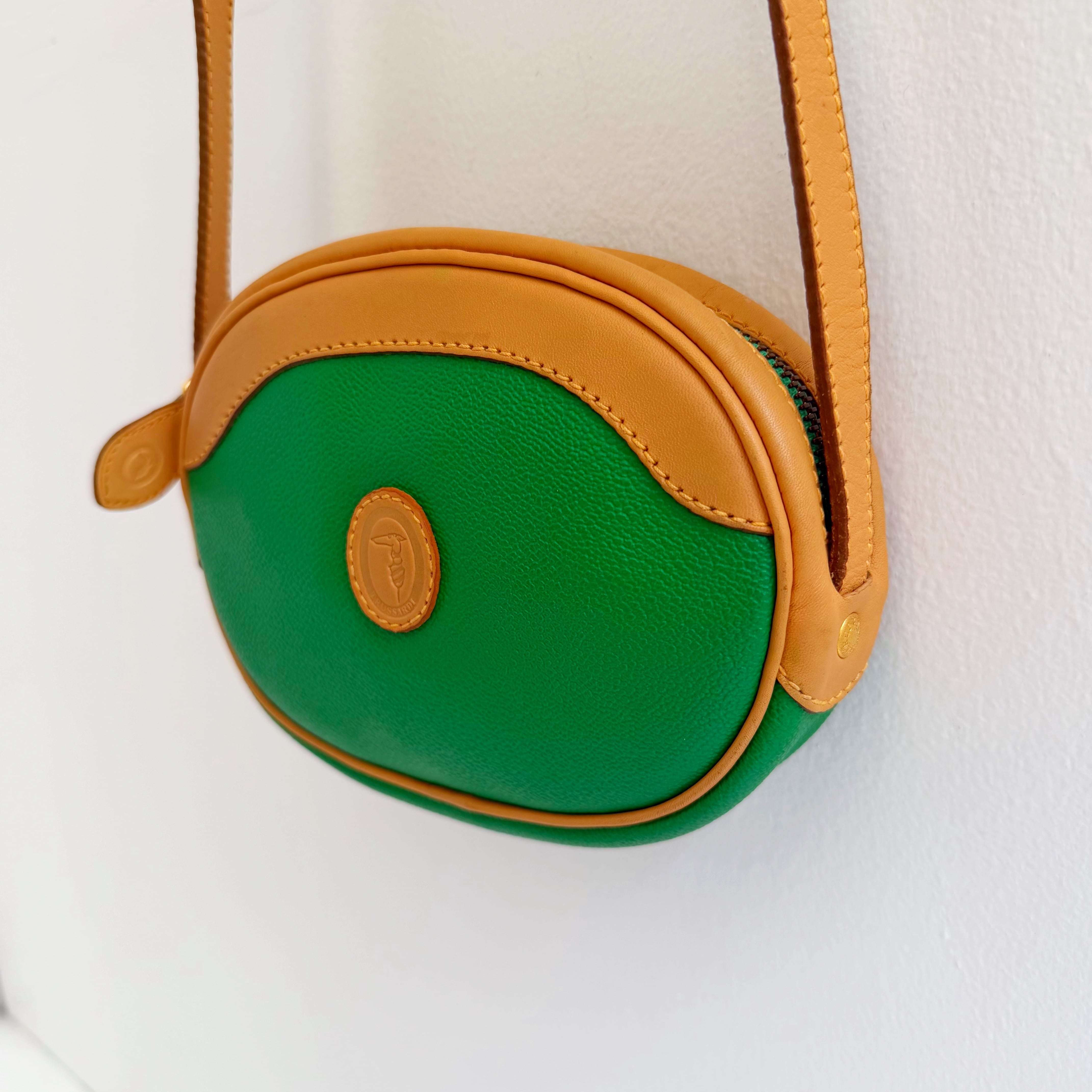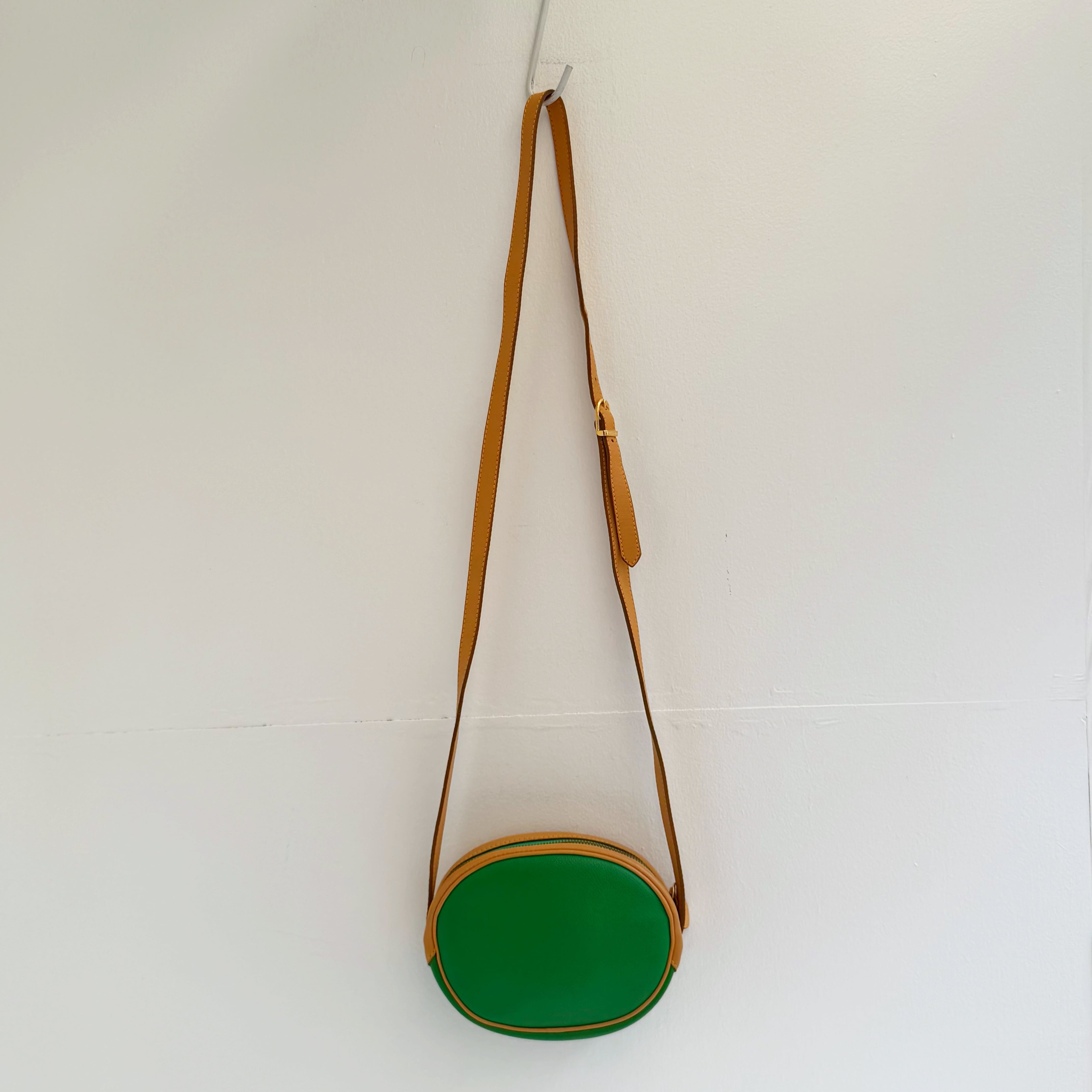 鮮やかなグリーンとベージュカラーのバイカラーショルダーバックです、