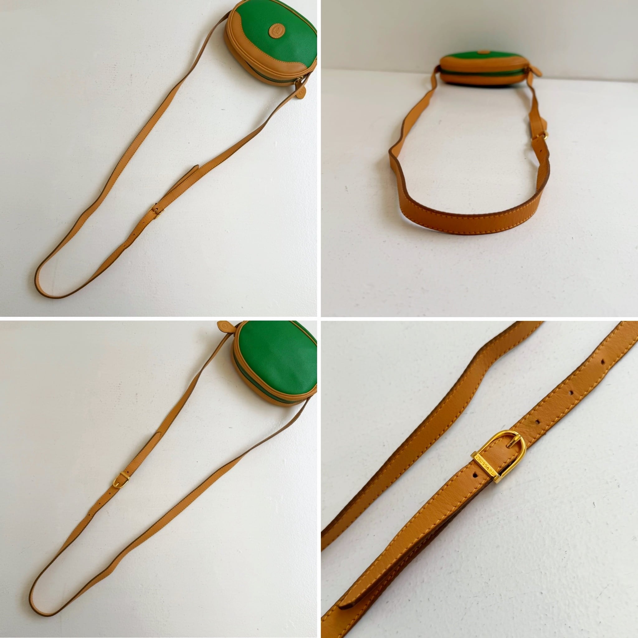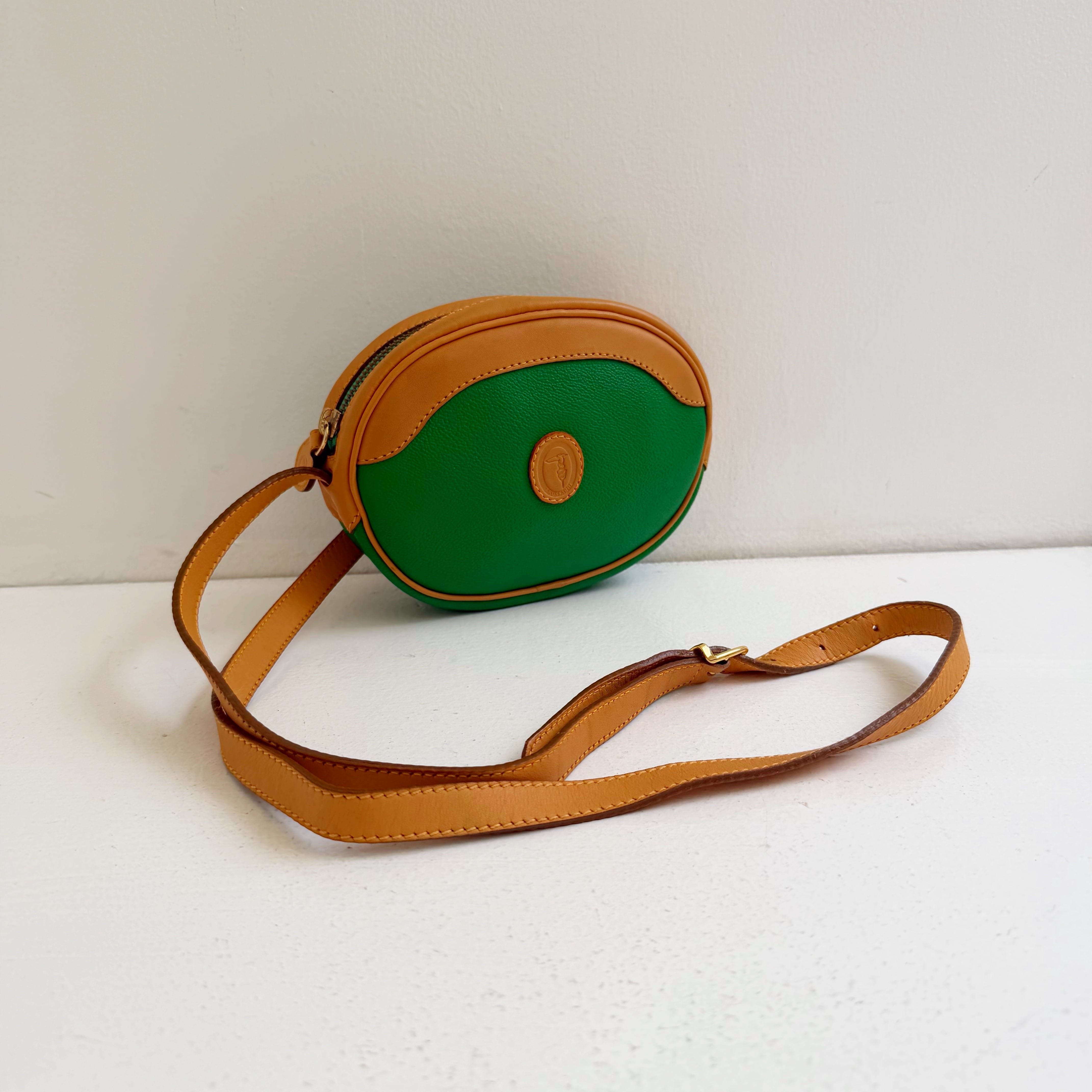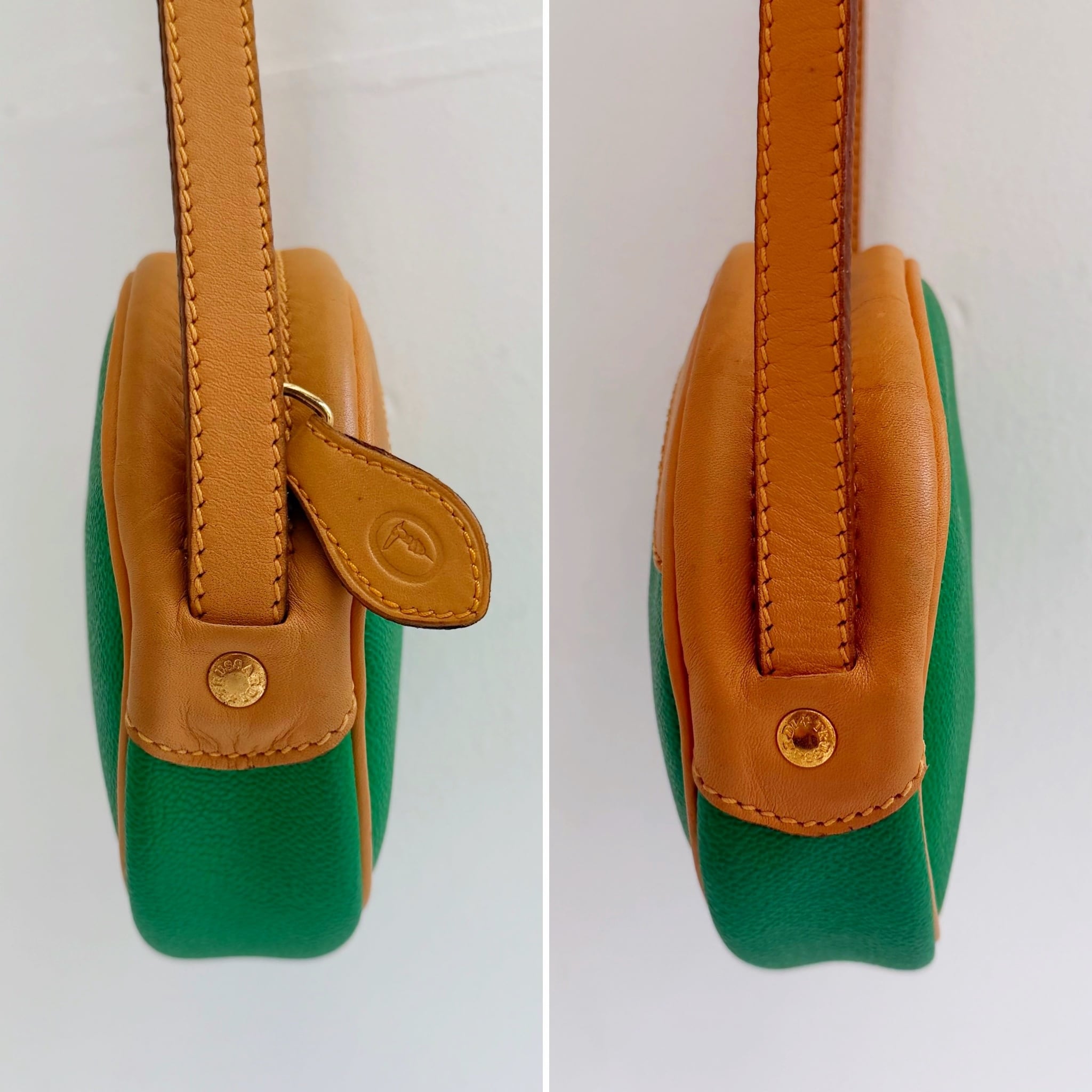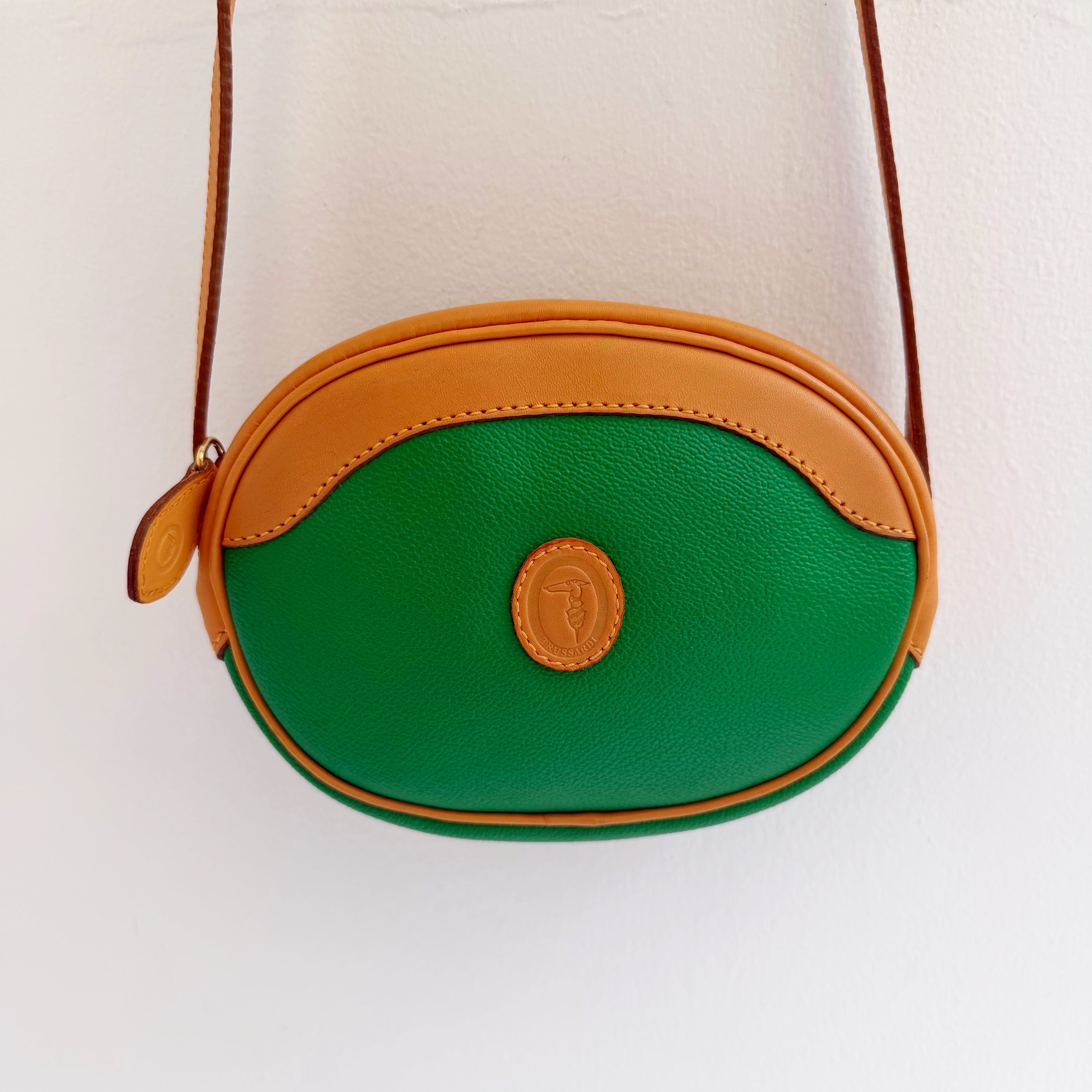 鮮やかなグリーンとベージュカラーのバイカラーショルダーバックです、
