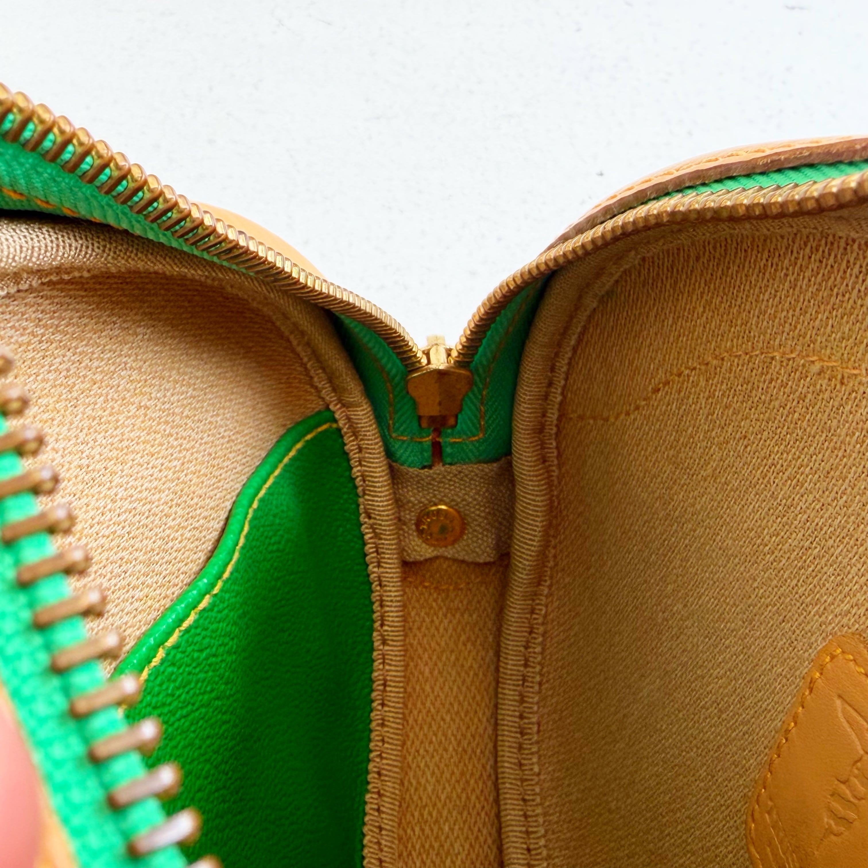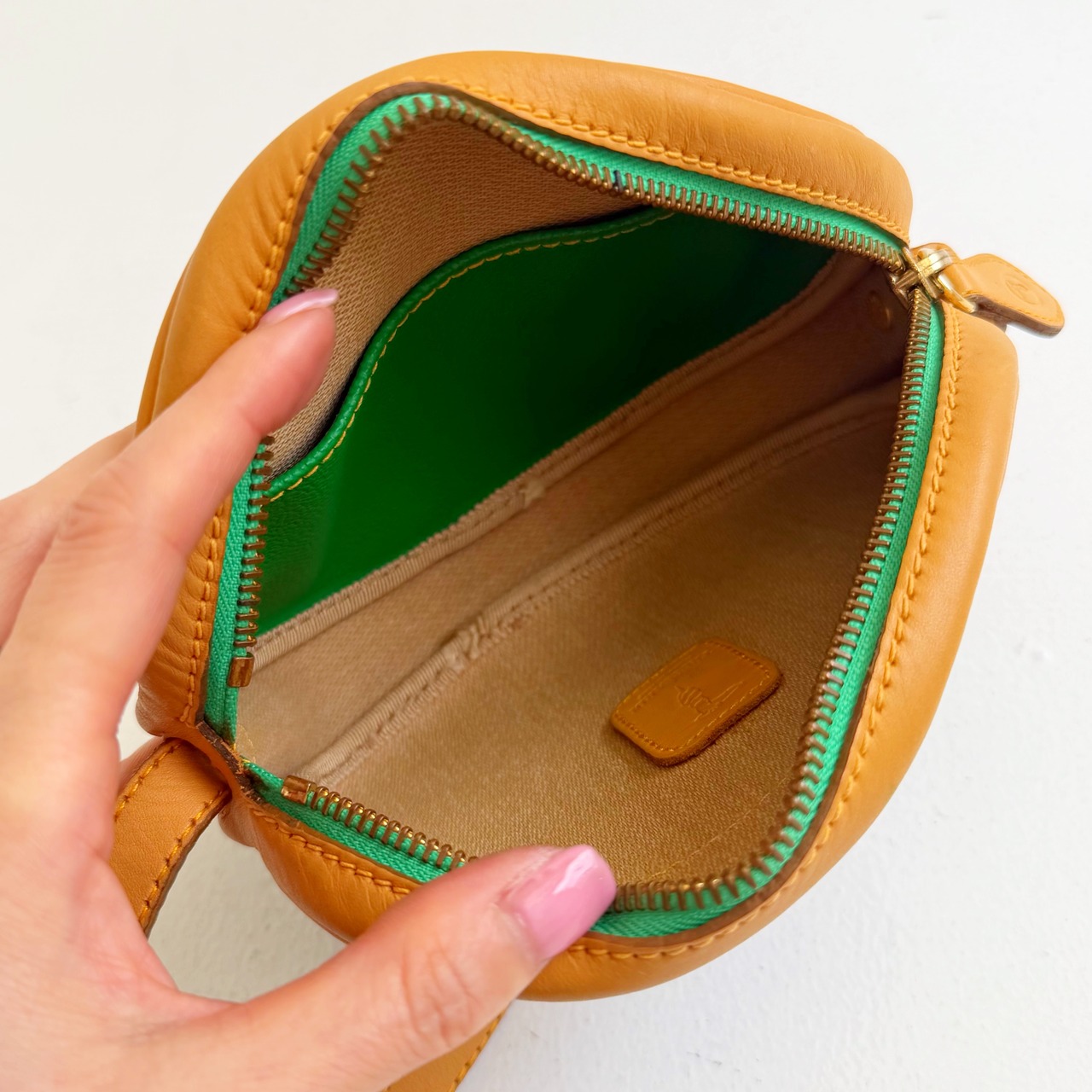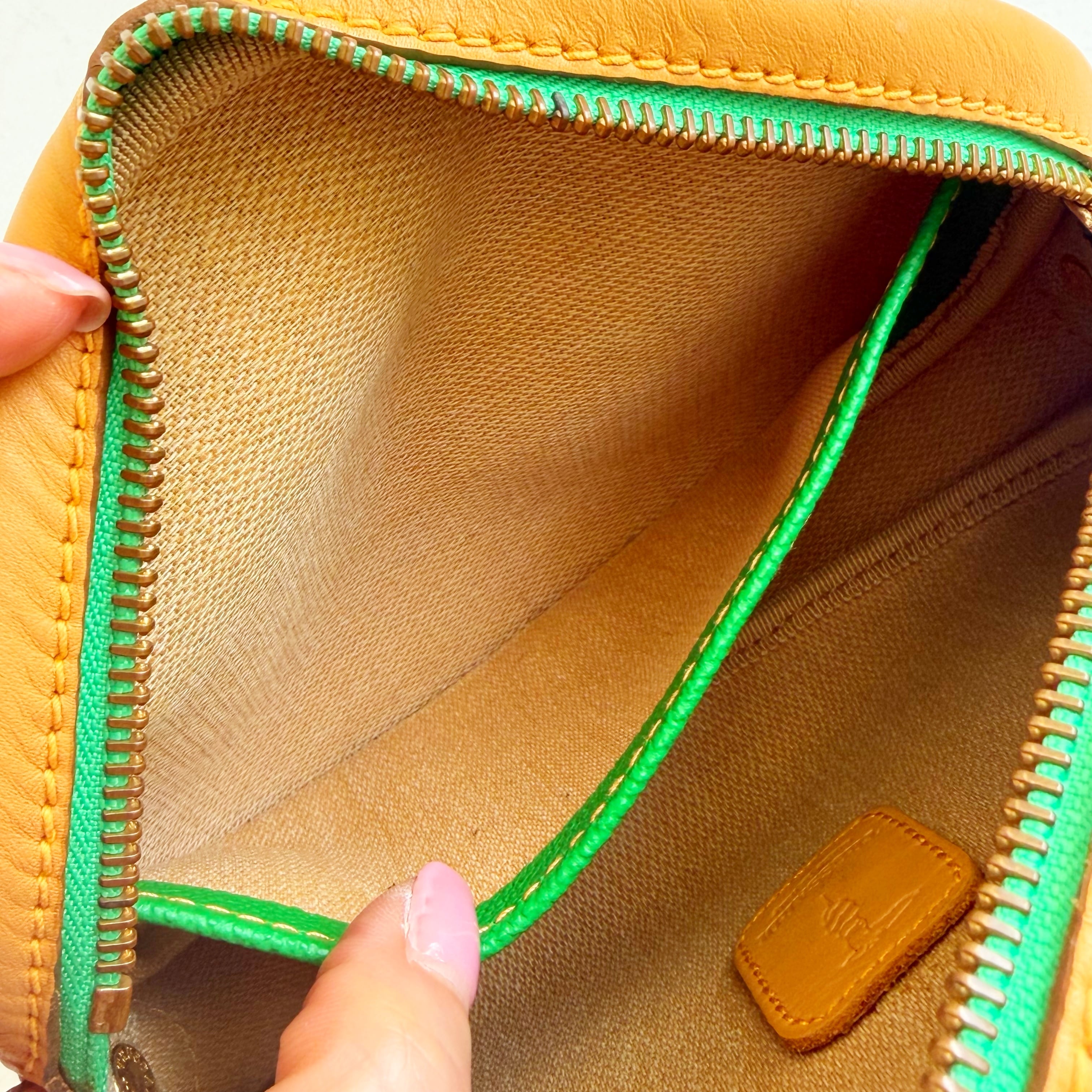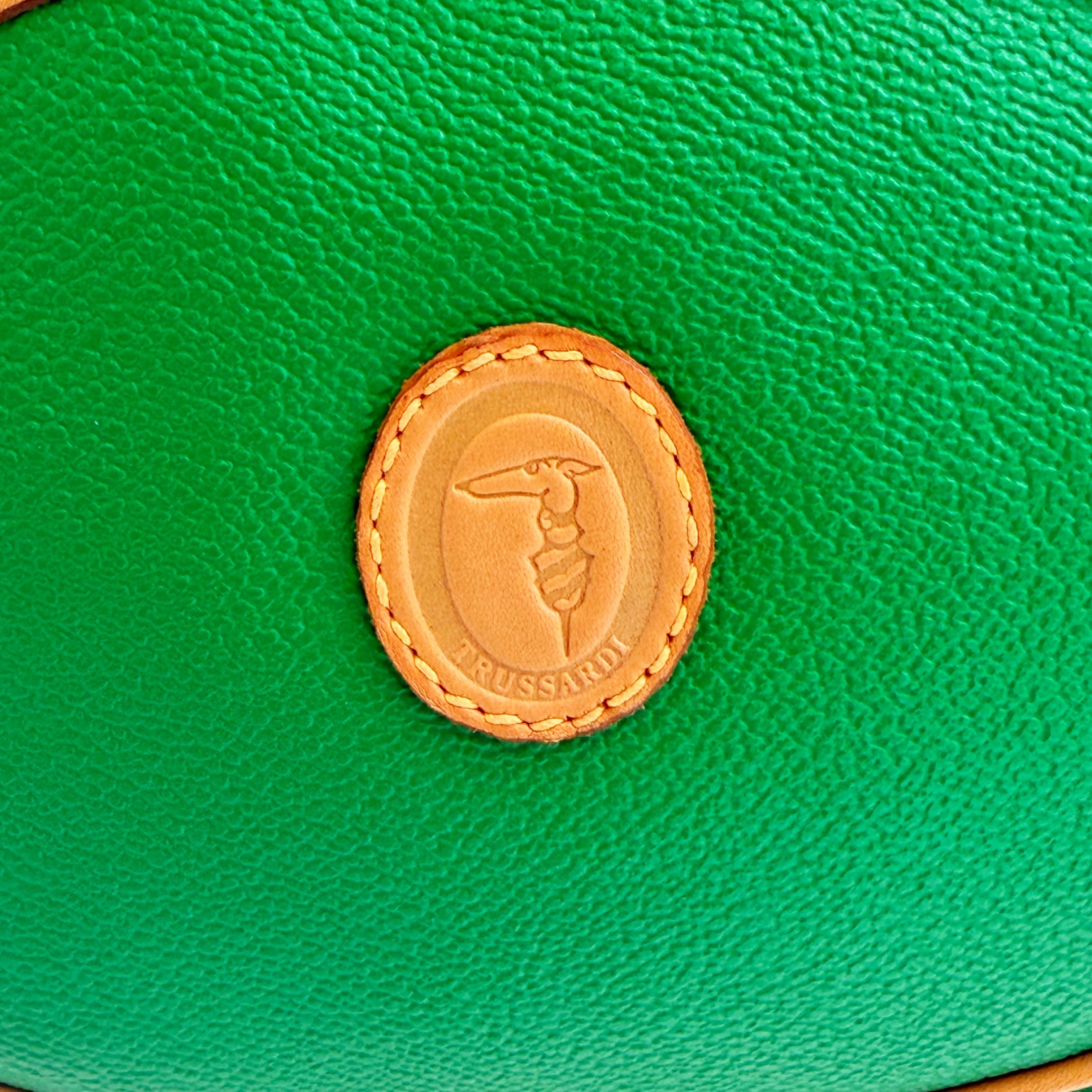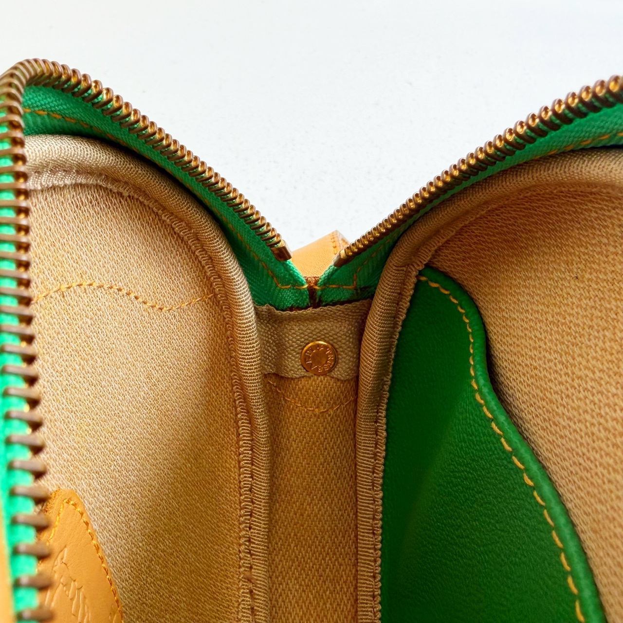 鮮やかなグリーンとベージュカラーのバイカラーショルダーバックです、